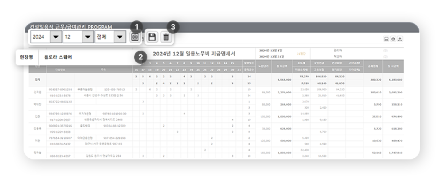 2️⃣ 선택한 월의 현장 수 · 인원 · 공수 · 지급액 · 소득세가 자동으로 표시됩니다.