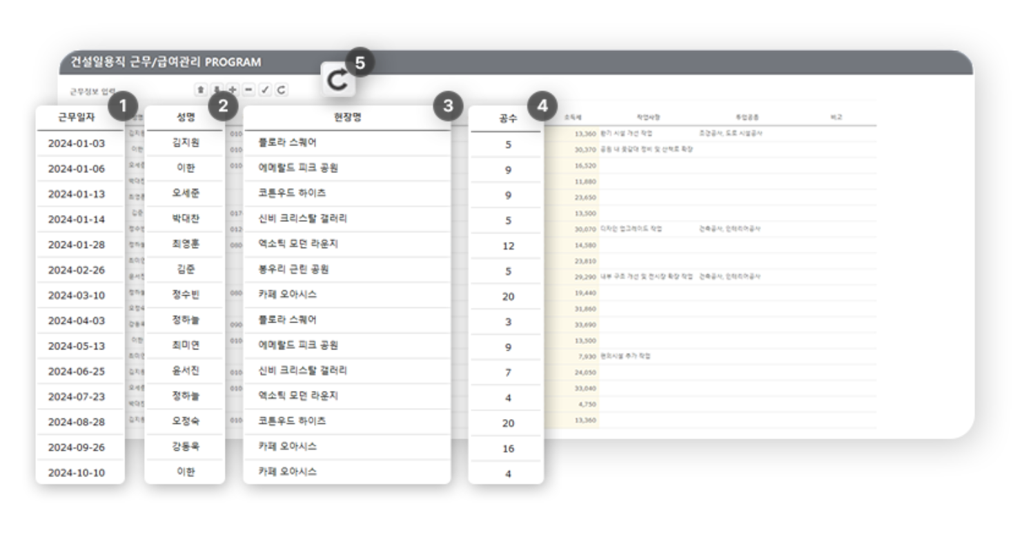 건설업 일용직 근무/급여관리 Program은 건설 업체에서 일용직 근로자의 근무 일자/공수/급여 등을 보다 편리하게 관리할 수 있도록 구성되어 있습니다. 일용직 근로자의 근무 내역을 자동으로 계