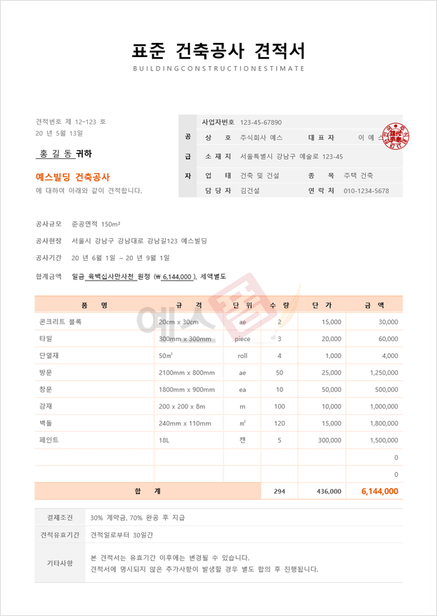표준 건축공사 견적서