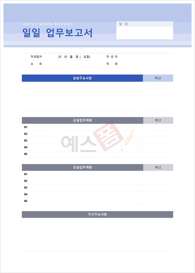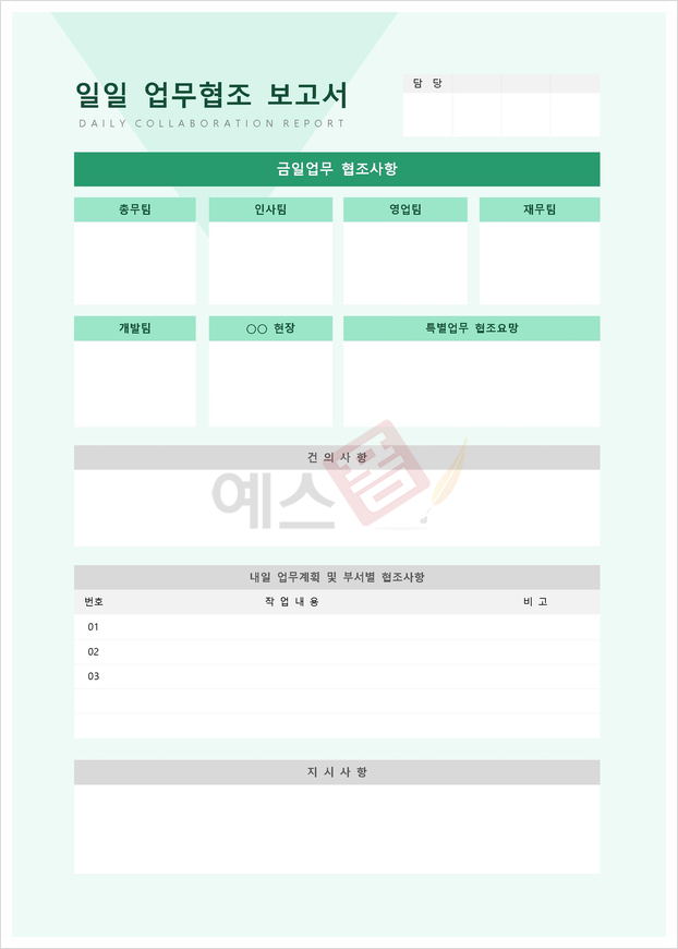 회사의 일일 업무를 보고하기 위한 보고서입니다. 금일 수행한 주요 업무와 익일 업무계획, 팀별 협조사항 및 건의사항, 지시사항 등을 기재하실 수 있습니다.