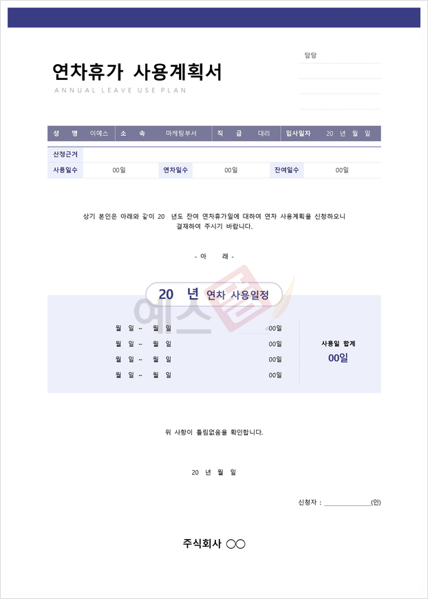| 연차휴가 사용계획서 | 예상 수입지출 계획서 | 품질계획서 |