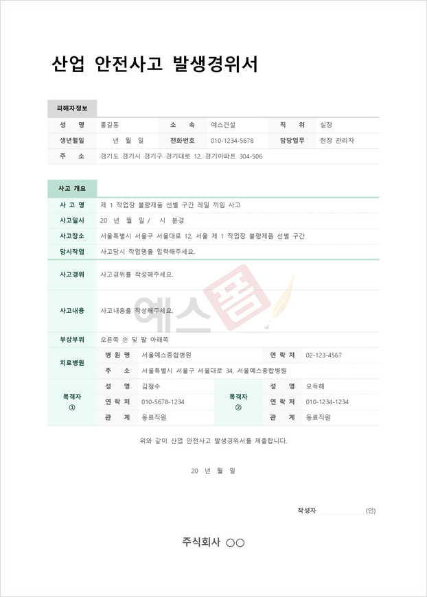 | 교통사고 경위서 (탑승자 인적사항) | 산업 안전사고 발생경위서 | 공사현장 사고경위서 |