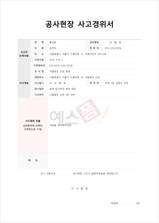 예스폼 사고경위서 양식을 통해서 건설현장에서 발생한 사고를 상세히 보고할 수 있는데요. 사고명과 사고일자, 사고장소, 사고내용 등을 자세하게 작성해 보실 수 있으며, 목격자가 있는 경우에 활용이 가능하도록 목격자 진술칸도 기재되어 있습니다. 특정 현장에서 발생한 사고 내용이 예시로 포함되어 있으니 참고하여 작성해 보시면 좋을 것 같습니다.