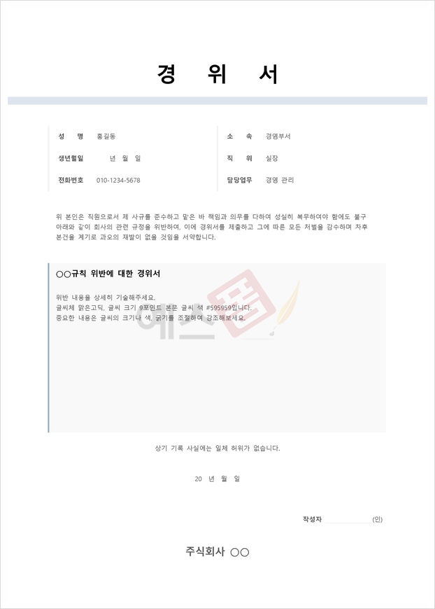 직원으로서 맡은 바 책임과 의무를 다하여 성실히 복무하여야 함에도 불구 회사의 관련 규정을 위반했을 때 제출하는 양식입니다. 성명과 소속 및 담당업무 등 내용을 기재하는 경위서(위반내
