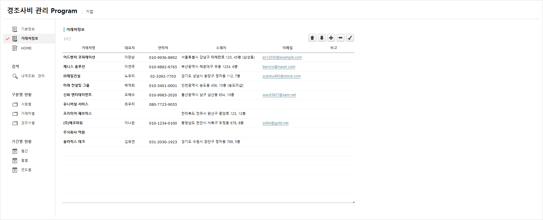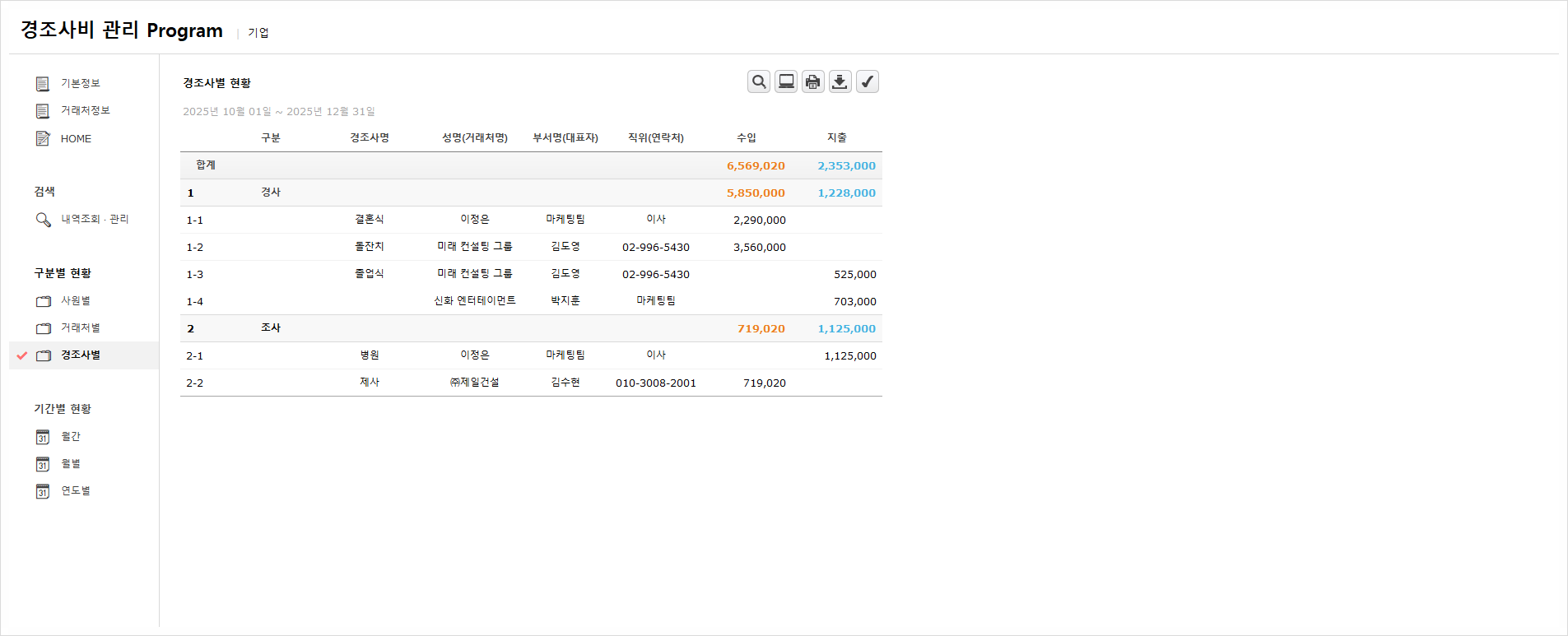 기업에서 경조사비를 관리하는 프로그램으로 직원별 경조사비 지급내역을 입력하여 검색, 수정 등 다양하게 관리하실 수 있고, 각종 통계기능을 이용하여 보다 편리하게 이용하실 수 있습니다.