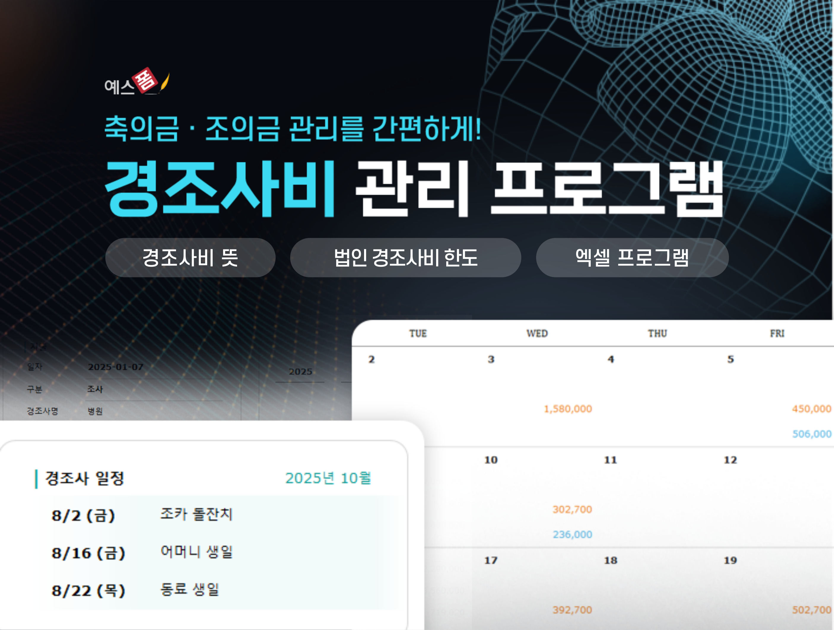 경조사비는 사회생활에서 피할 수 없는 지출 항목 중 하나입니다. 결혼식, 장례식, 출산, 승진 등 다양한 행사에서 경조사비를 지급하는 것은 사회적 관계를 유지하는 데에 필요한데요. 친구, 직장 동료, 친척 등 관계에 따라 얼마가 적당할지, 법인이라면 법적으로 얼마까지 비용 처리가 가능한지, 매년 발생하는 경조사비를 효율적으로 관리할 수 있는지는 많은 분들이 고민하는 부분입니다. 특히 개인과 기업은 경조사비 관리 방식이 다르며, 기업의 경우 비용 인정 기준과 한도가 법적으로 정해져 있어 체계적인 관리가 필요합니다. 이러한 문제를 해결하기 위해 예스폼에서 개인과 기업 모두 효율적으로 경조사비를 관리할 수 있는 엑셀 프로그램을 업데이트하였습니다.