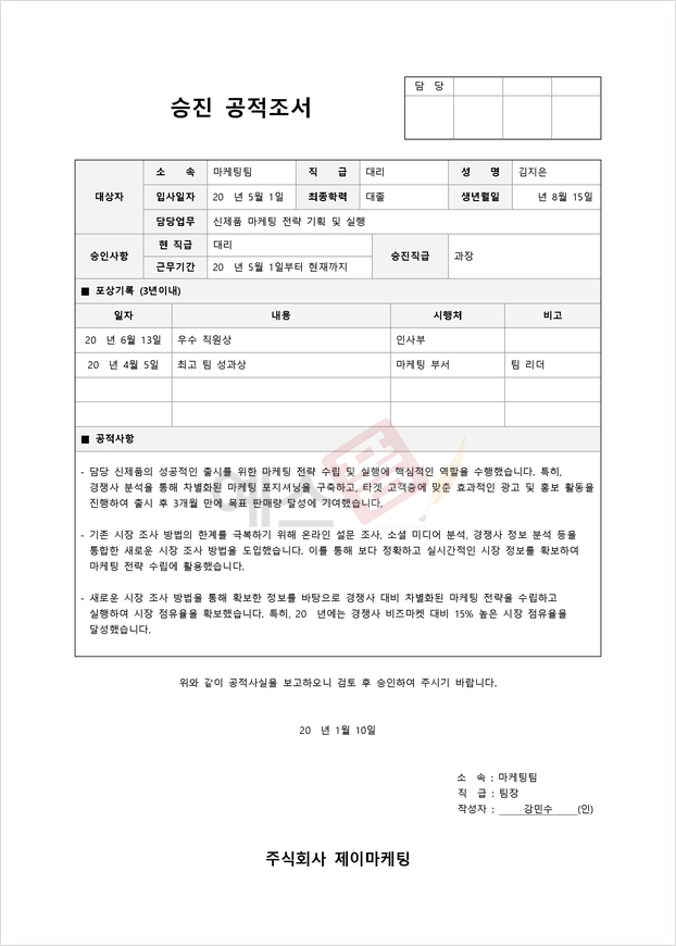 승진 심사에서는 직원이 일정 기간 동안 어떤 성과를 냈는지 그리고 회사의 가치에 어떻게 기여했는지 확인하는 게 중요합니다. 공적조서는 승진 대상자의 실적을 체계적으로 정리하여, 경력 발전에 필요한 정보를 제공합니다.