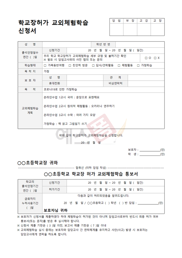 초등학교 교외체험학습 신청서 (통보서 포함) |
