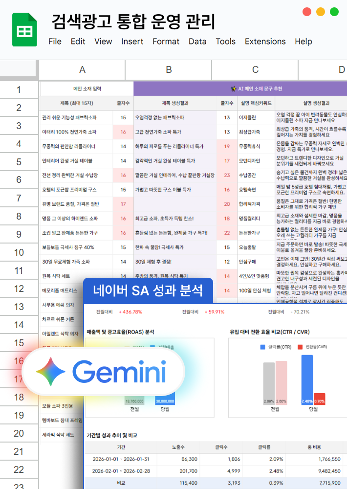 네이버 검색광고의 기획부터 소재 제작, 입찰 관리, 성과 보고까지 모든 과정을 자동화할 수 있는 템플릿입니다.