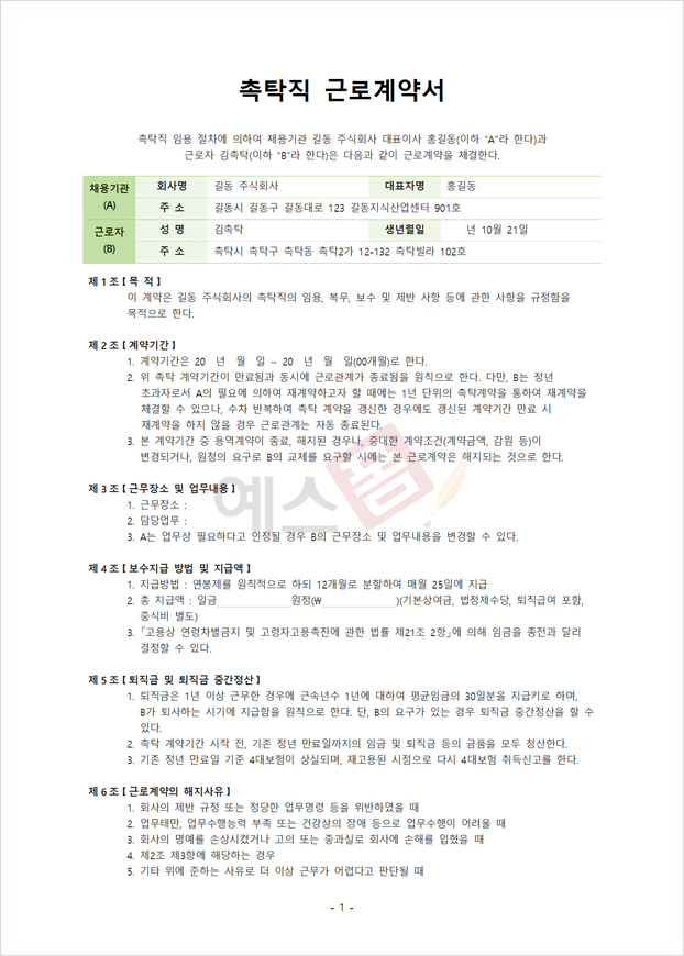 특정한 업무를 수행하기 위해 정해진 기간 동안 근로계약을 체결한 근로자인 촉탁직 근로자의 근로계약서 양식 예시입니다.