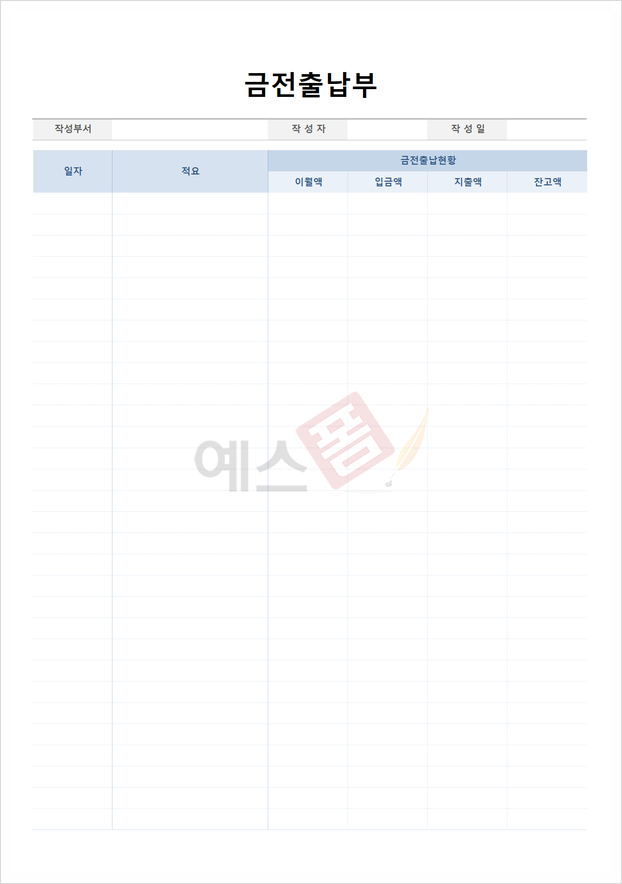 금전출납부를 작성하게 되면 회사의 자금이 어떻게 사용되고 있는지 돈의 흐름을 파악하여 보다 더 효율적으로 회사 자금을 관리 및 사용하실 수 있습니다. 금전출납부를 작성하실 땐 공과금, 통신비 등과 같이 통장에서 자동이체가 되는 것은 해당되지 않으니 반드시 확인하여 올바른 금전출납부를 작성하시기 바라는데요. 금전출납부를 작성하실 때 저희 예스폼에서 제공드리는 다양한 금전출납부 양식을 활용하신다면 더 빠르고 편리하게 작성하실 수 있으실 겁니다.