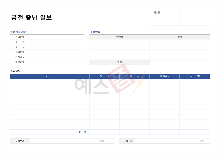 현금 및 예금의 현황과 거래 내역을 정리한 금전 출납 일보 서식 및 예시입니다. 현금 시재와 예금 현황이 나와있으며, 각 예금 별 잔액과 현금 출납 내용이 상세히 표시되어 있는데요. 구매부서와 구매자의 정보와 사인이 첨부되어 있으며, 예스폼 금전 출납 일보를 활용하시면 금전 거래를 더욱더 체계적으로 기록하는 데 사용할 수 있습니다.
