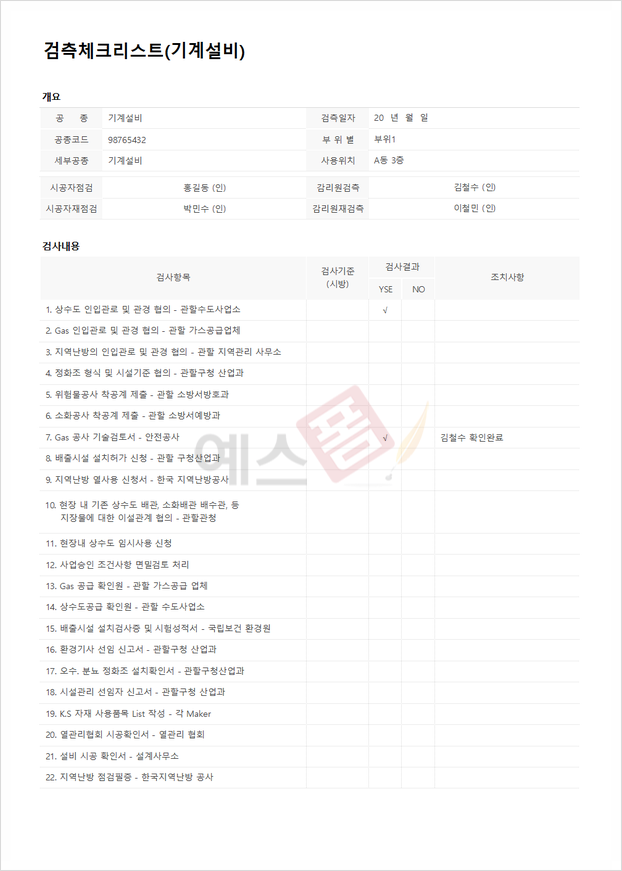 2024년에는 기계설비유지관리자 미선임 시 과태료가 부과되는데요. 아직 확정된 내용은 아니지만 기계설비 성능점검 결과보고서 제출이 의무화가 될 것이라는 의견도 있습니다. 오늘은 예스폼에서 기계설비법에 대한 해당 내용을 알아보려 하는데요. 예스폼에서 서비스 중인 검측체크리스트, 기계설비 사용 전 확인표, 안전확인서, 운영계획서 등의 기계설비양식 추천도 준비하였으니 참고해 보시기 바랍니다.