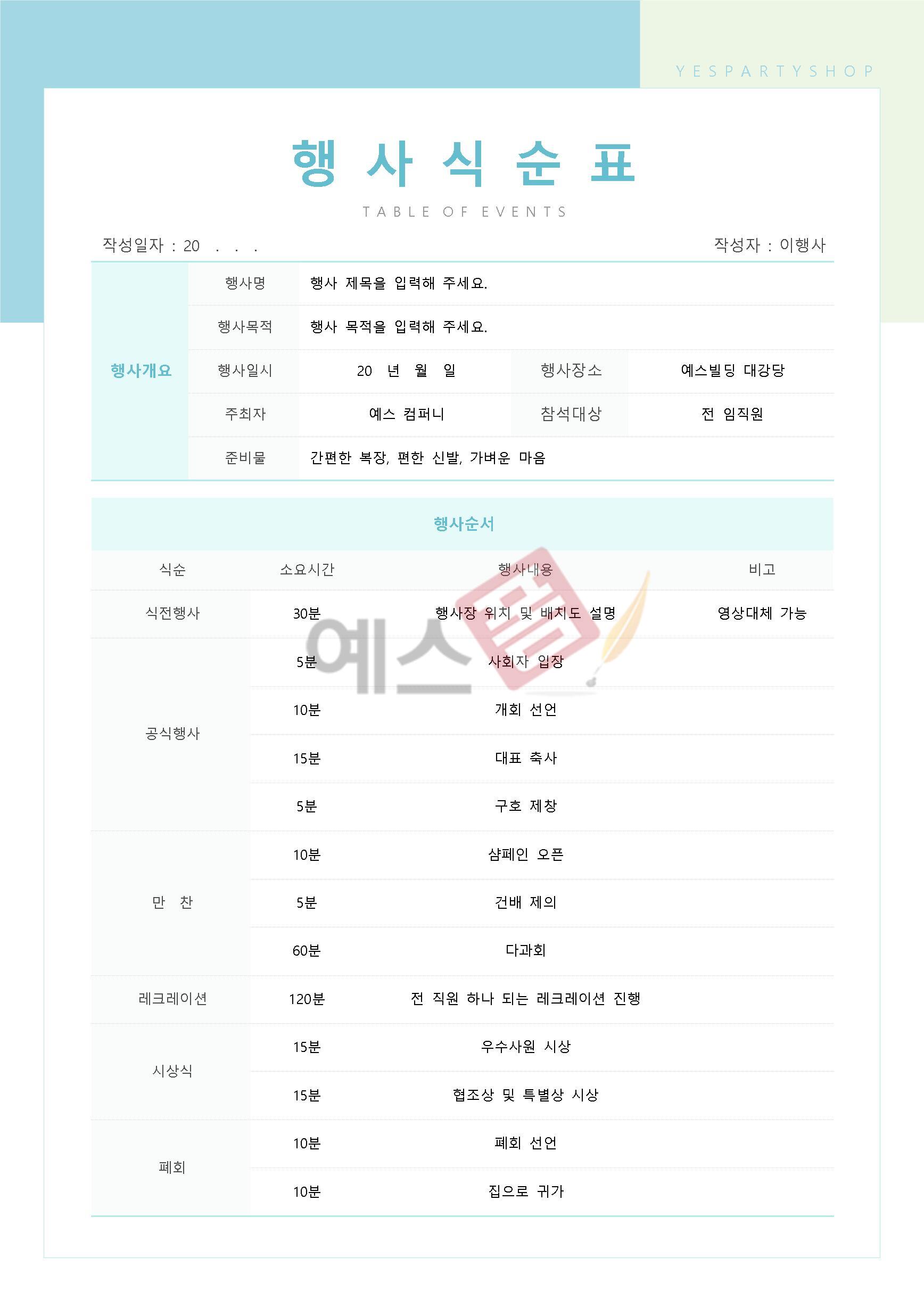 직장인 분들을 위해 예스폼에서는 다양한 행사 관련 양식을 서비스하고 있습니다. 행사 기획안, 견적서, 초대장, 안내문 등 다양한 양식을 활용해 보시기 바랍니다.