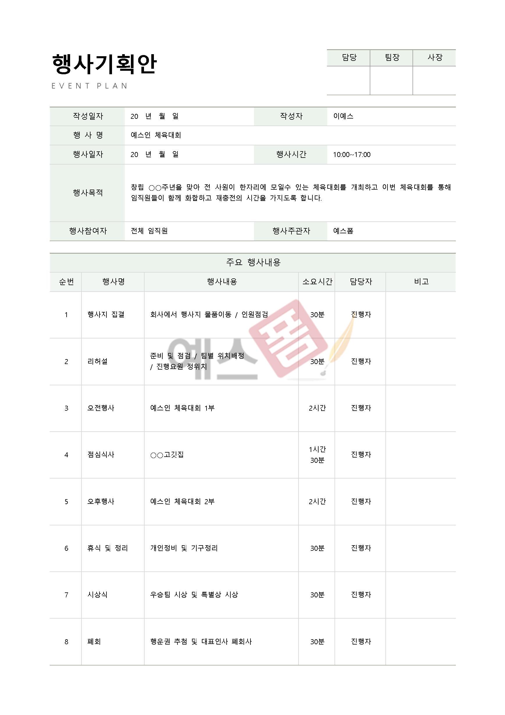 | 행사 진행 계획서 | 행사 진행 순서, 시간표, 역할 분담 등을 포함한 문서 |