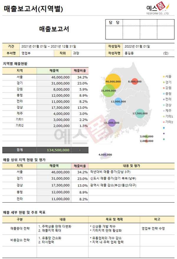 해당 기간의 지역별 매출액을 입력하면 지도상의 차트가 자동으로 생성되는 매출보고서 양식입니다. 매출 상위 지역 현황 및 평가와 세부 현황을 기재하여 더 상세한 매출 보고를 하실 수 있습니다.