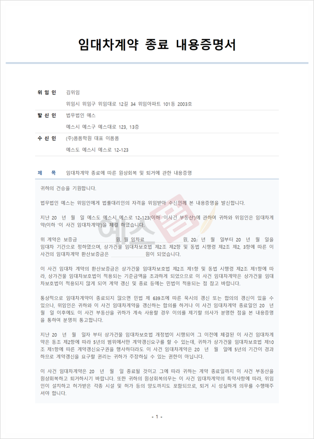임대차 계약 종료 내용증명서 (임대차보호법 미적용) |