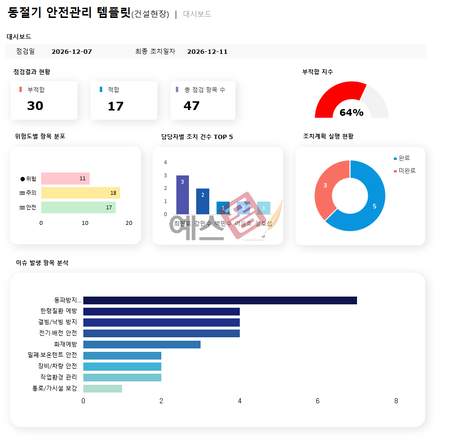 안전점검 체크 대시보드(동절기 건설현장) 엑셀양식 - 입력만 하면 자동 계산되는 엑셀 템플릿을