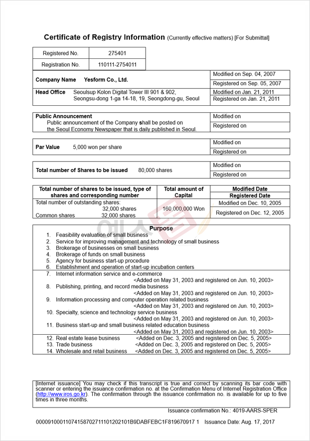 Company Name, Head Office, Public Announcement, Par Value, Total number of Shares to be issued으로 구성되어 있는데요. 영문 등기부등본이 필요한 경우 해당 예문 양식을 참고하여 작성 및 확인하시기 바랍니다.