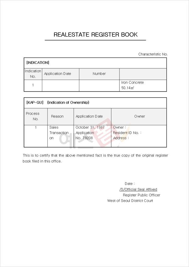 영문으로 기재할 수 있도록 제작된 영문 등기부등본입니다. 비자를 신청하는데 필요한 등기부등본입니다. 부동산의 경우 자세한 내역을 모든 사람이 열람할 수 있도록 등기부에서 관리하고 있는데요. Application Date, Number을 작성할 수 있는 INDICATION과 Reason, Application Date, Owner을 작성할 수 있는 KAP-GU로 구성되어 있습니다.