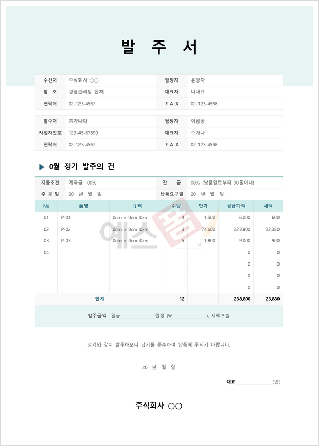 | 발주서 (기업 표준) | 발주서 (납품과 결제조건) | 발주서 (물품 나열) |