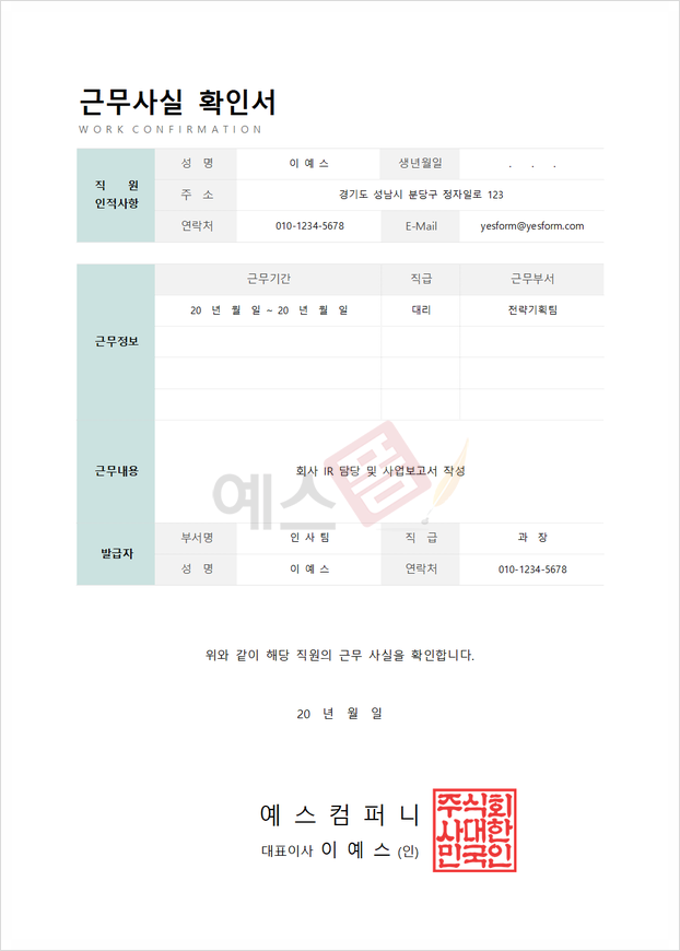 예스폼 근무 사실 확인서의 경우,