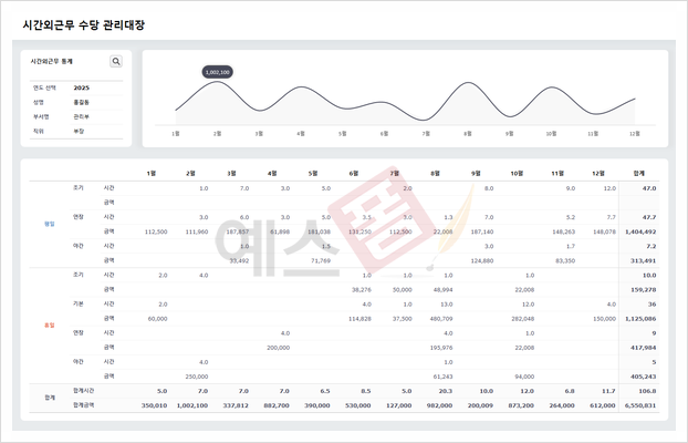 💻 시간 외 근무 수당 관리대장(조기/연장/야간근무)