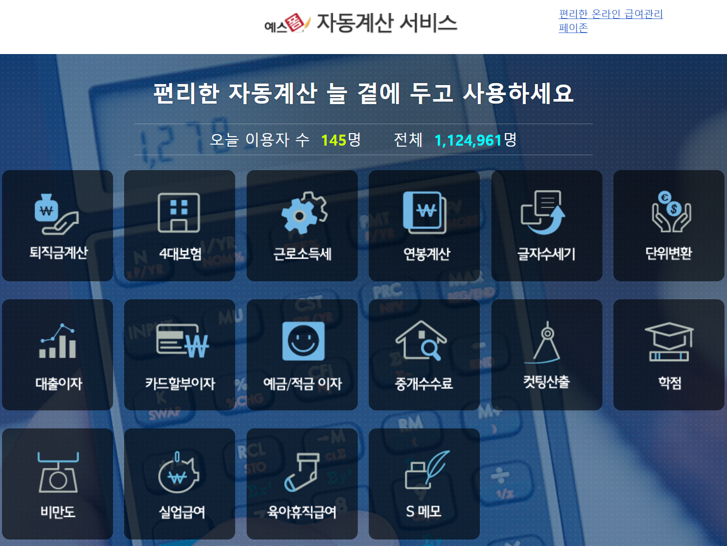 편리한 자동계산 무료서비스, 퇴직금, 4대보험, 근로소득세, 연봉계산, 글자수세기, 단위변환, 대출이자, 카드할부이자, 예금/적금 이자, 중개수수료, 컷팅산출, 학정, 비만도, 실업급여, 육아휴