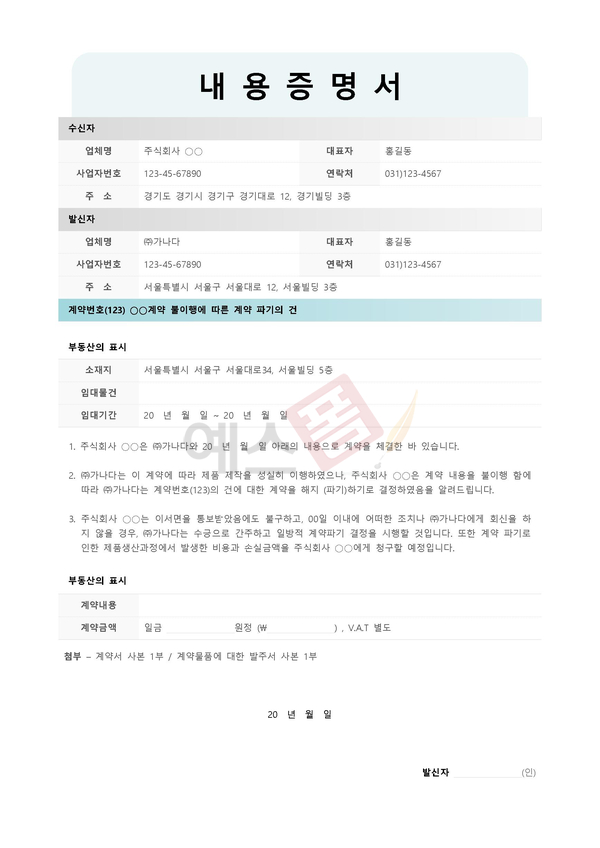 | 내용증명서 (계약파기 고지) | 내용증명서 (계약이행 촉구 및 해제 통보) | 내용증명 (계약해제 및 손해배상 청구) |