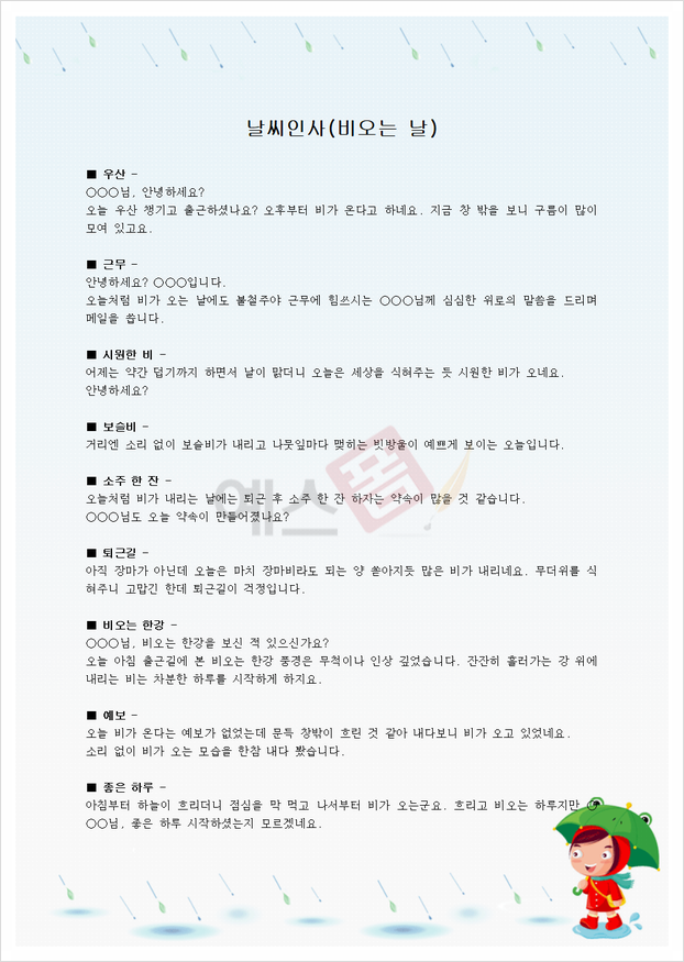 ✅ 예스폼 (인사말) 비 오는 날 날씨 인사(30개 예문 모음)
