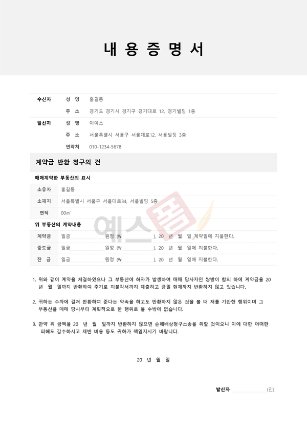 내용증명서 (계약금 반환 청구) | 내용증명서 (차량 반납 요청) | 내용증명서 (납품자재 반환청구) |