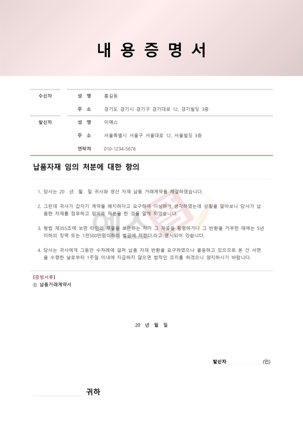 계약 합의사항 위반으로 계약금, 차량, 납품자재 등의 물품을 반환해 줄 것을 청구하는 내용증명서입니다. 반납일시와 반납물품, 반납장소 등의 내용을 기입하셔서 부당하게 발생한 손실을 돌려받으시길 바랍니다.