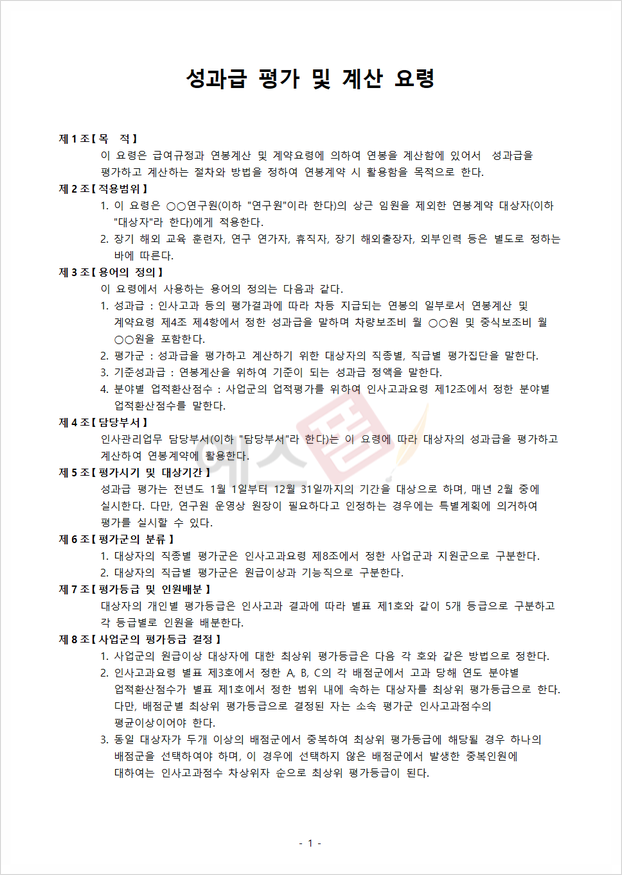 예스폼에서는 연봉 계약 시 활용할 목적으로 작성된 성과급평가 및 계산요령 양식을 제공 중에 있는데요. 해당 양식의 경우 급여규정과 연봉계산 및 계약 요령에 의하여 연봉을 계산함에 있어, 관련 성과급을 평가하고 계산하는 절차 및 방법 등을 정하여 연봉 계약 시 활용해 볼 수 있으므로 만일 성과급평가에 대한 내용 숙지가 잘 되어 있지 않은 상황이라 관련 도움이 필요하신 분들 또는 계산 요령에 대해 자세히 알아가고자 하고픈 분들이라면 해당 내용을 참고해 보시기 바라겠습니다.