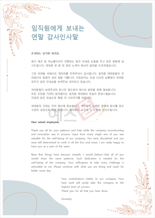 일 년 동안 회사를 위해 힘써준 임직원들에게 대표이사가 보내는 감사인사말 예문 모음입니다.