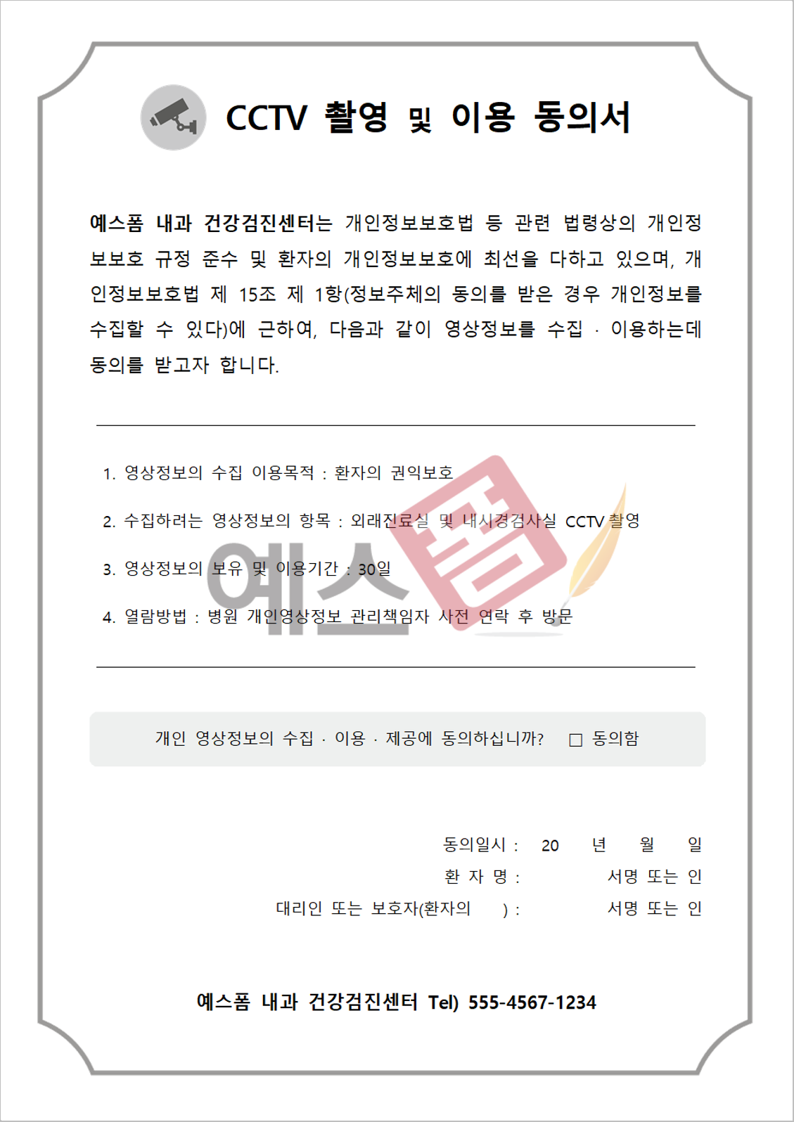 오늘은 이와 관련하여 여러분들에게 CCTV 촬영 및 이용동의서 양식을 소개드리려고 합니다. 내과, 검진센터, 병원 등에서 사용할 수 있으며, 텍스트 수정 시 수술실, 병원, 내시경실에서도 사용 가능한 서식입니다. 하단에서 함께 확인해 보시고, 이외 추가적으로 CCTV 관련된 양식을 찾으신다면 예스폼 홈페이지를 방문해 보시길 바랍니다.