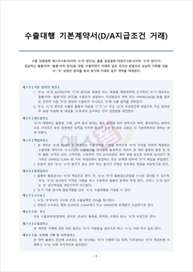 수출 대행 계약서(D/A 지급조건) - 부서별서식
