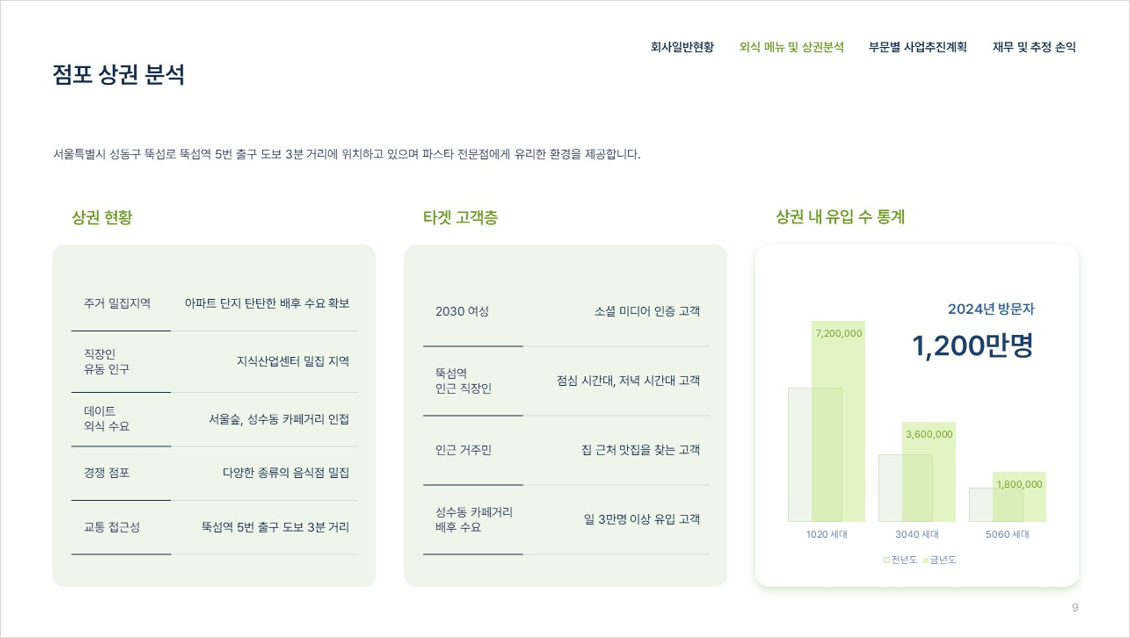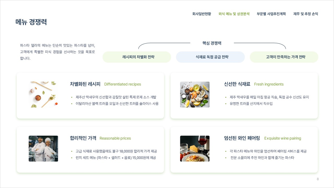 이탈리안 레스토랑 창업 사업계획서 (피자 파스타 전문점)에 대해 자료입니다. 이탈리안 레스토랑 창업에 관한 샘플을 생성형AI 기술을 활용하여 예시로 제작된 샘플 예제이며 실제 파스타 창업에 도움되는 목차와 템플릿으로 구성되어 있어 사업 및 정책자금 용도로 적용하기에 유용한 자료입니다.