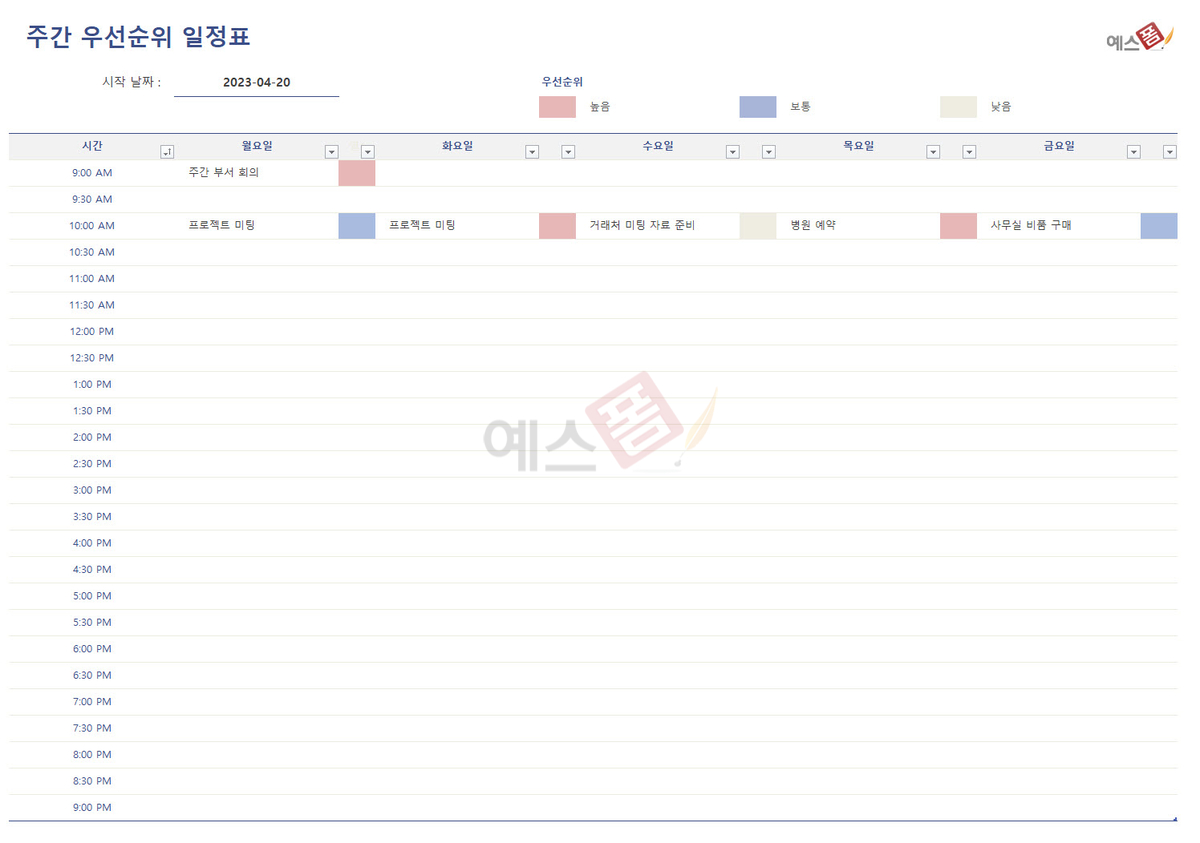 요일/시간별로 일정 계획을 입력하고 우선순위를 표시할 수 있는 주간 우선순위 일정표 엑셀/구글시트입니다. 드롭다운을 통해 우선순위를 선택할 수 있으며, 해당하는 색상으로 반영되어 확인이 용이합니다. 표 오른쪽 하단을 드래그하여 시간을 자유롭게 추가할 수 있습니다.
