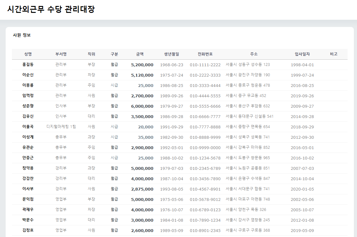 성명, 급여 등을 포함한 사원 정보를 입력합니다.