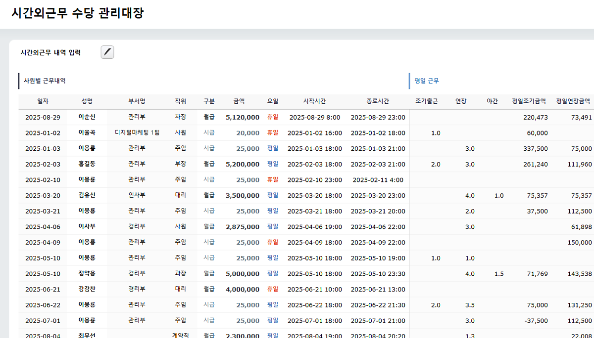 시간 외 근로 수당 관리 대장 엑셀 템플릿