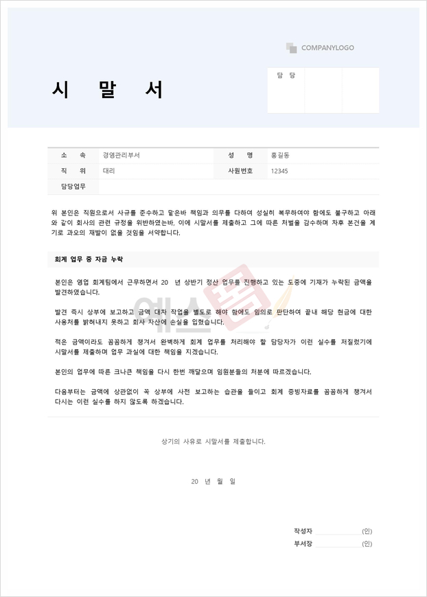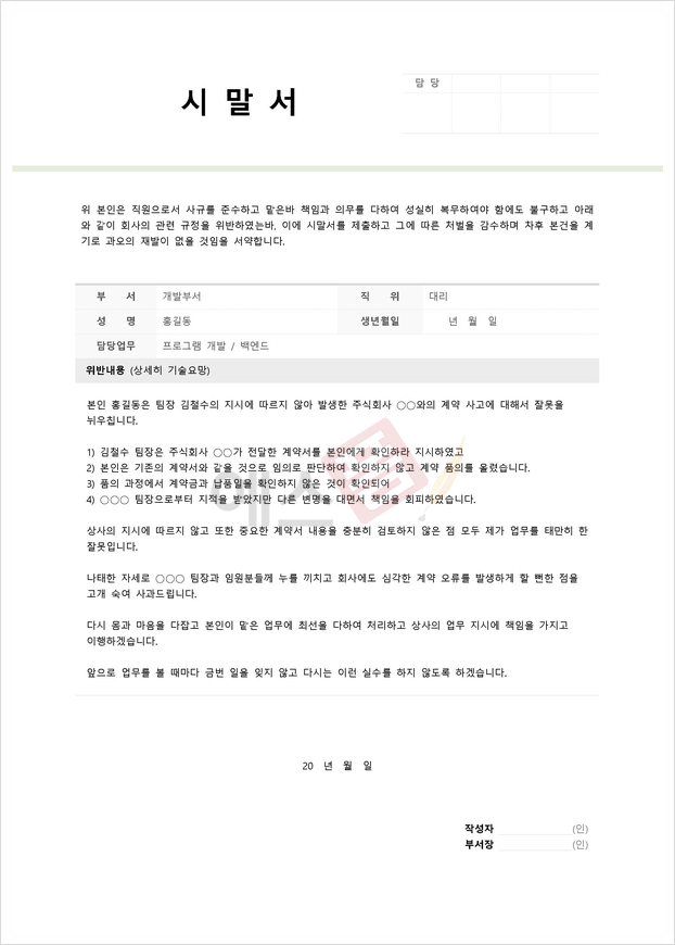시말서 (회계자금 누락) | 시말서 (지각) | 시말서 (무단 결근) |