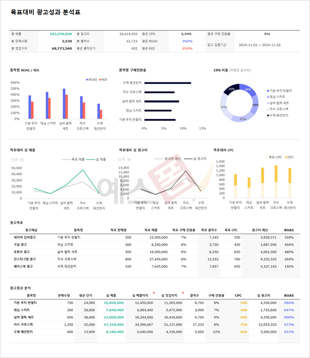 여기까지 소개드린 실적 보고서 & 매출 분석표 엑셀 템플릿 이외에도 목표 대비 광고 성과 분석표, 매출 현황 표 대시보드 등 다양한 업무관리 엑셀 템플릿을 활용하여 업무 효율성을 높여보시길 바랍니다. 엑셀뿐만 아니라 구글 시트로도 사용이 가능하니, 더욱 편리하게 업무를 관리해 보세요!