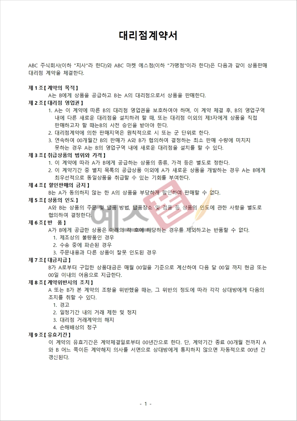목적, 제품, 대리점의 권한, 자사의 의무, 공급가격, 영업지역, 실적보고, 영업정보, 고객서비스, 계약기간, 지적재산권, 불가항력, 해지, 비밀유지, 기타 사항, 분쟁해결, 특약사항 등의 내용으로 구성된 대리점계약서(지사, 가맹점) 작성 시 기입하여 사용할 수 있도록 제작되었습니다.