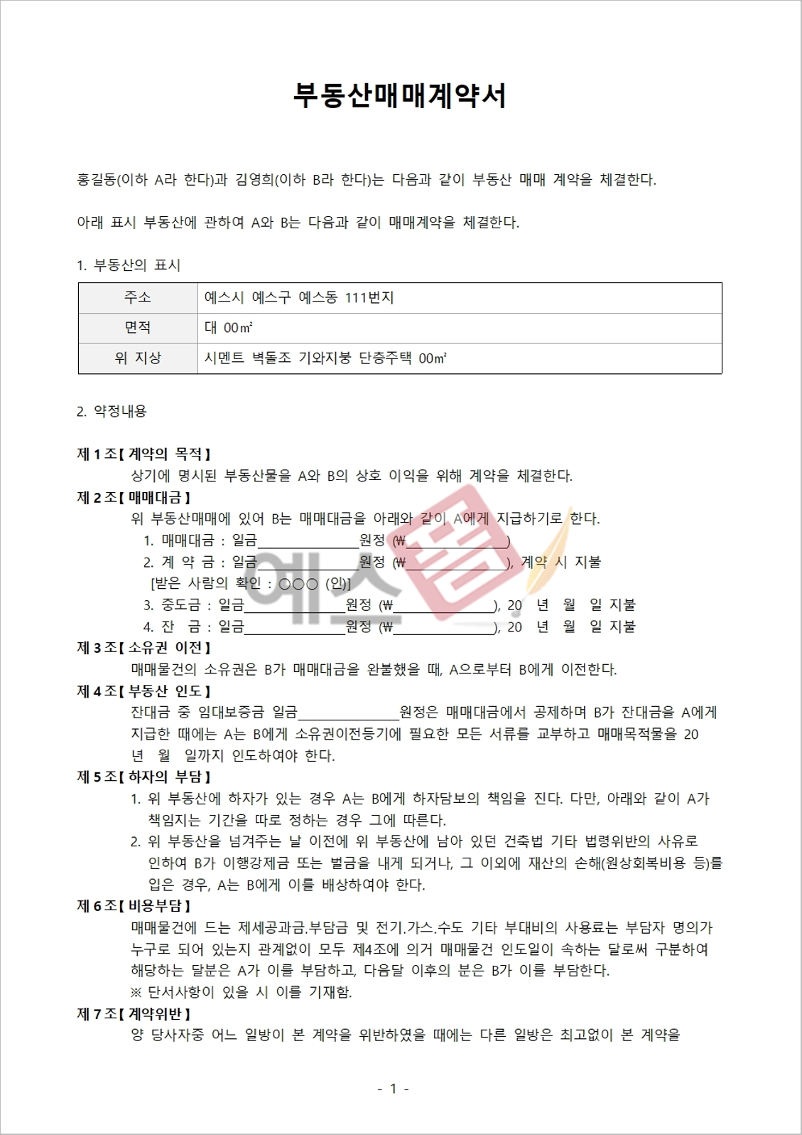 부동산매매계약서는 부동산매매 시 필요한 계약서로 매매대금 및 지급시기, 소유권이전, 각종권리, 제세공과금, 부동산의 인도, 계약의 해제에 관한 사항으로 구성되어 있습니다.