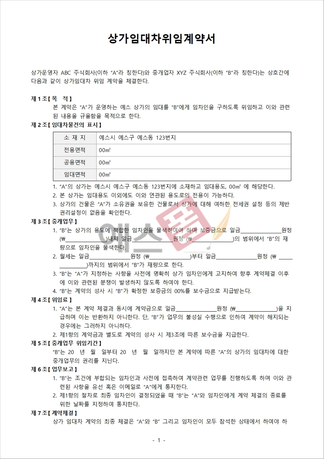 상가건물을 임대차하면서 필수사항만 간단하게 작성하는 경우 사용하는 표준적인 임대차계약서입니다.