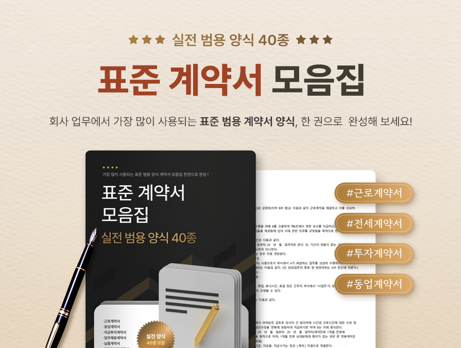 📜 계약서 작성에 어려움을 겪고 계셨다면, 이번 기회에 '표준계약서 40종'을 활용하여 거래의 신뢰성을 높여보세요! 여러분의 성공적인 비즈니스를 위한 든든한 동반자가 되어줄 것입니다!