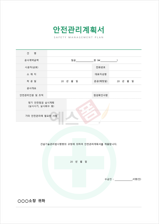 이에 예스폼에서는 공사현장의 안전 관리 계획을 작성하기 위한 양식으로 안전관리계획서를 제공 중에 있는데요. 건명과 공사 계약 금액 및 공사개요는 물론 공사 관련 내용을 기재하여 사업주와 근로자 간의 안전보건 관련 정보를 서로 공유할 수 있는 양식이므로, 안전보건관리 관련 내용을 근로자들이 알게끔 해야 하는 사업주의 경우 해당 양식을 활용하시어 안전한 공사를 위한 계획서 작성을 진행해 보시기 바라겠습니다.