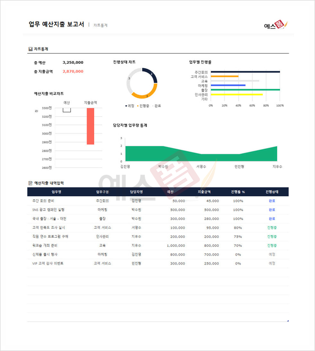 입력된 내역을 바탕으로 업무 예산, 지출 금액, 업무 진행률, 진행 상태 등 차트 통계가 자동 생성됩니다.