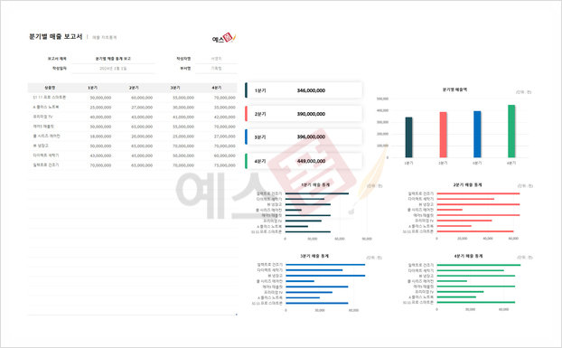 각 분기별 상품 성과 내역을 입력하고 차트 통계로 시각화하여 확인할 수 있는 분기별 매출 보고서 템플릿입니다.