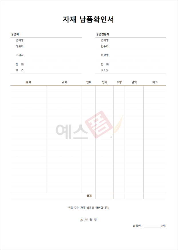 예스폼 자재 납품 확인서(식재료 유통 업체)